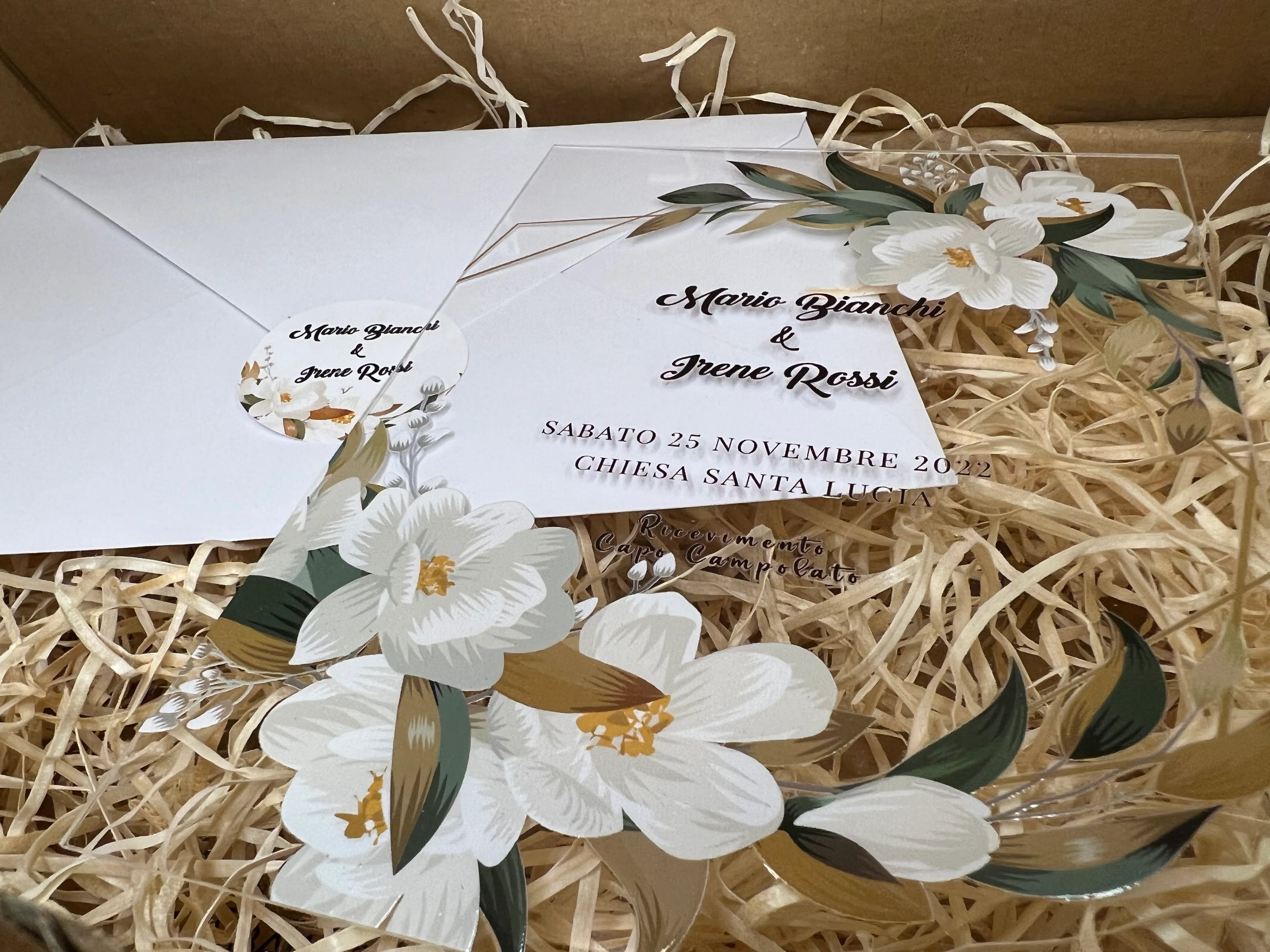 Invito partecipazione nozze personalizzato realizzato in plexiglass trasparente, busta inclusa